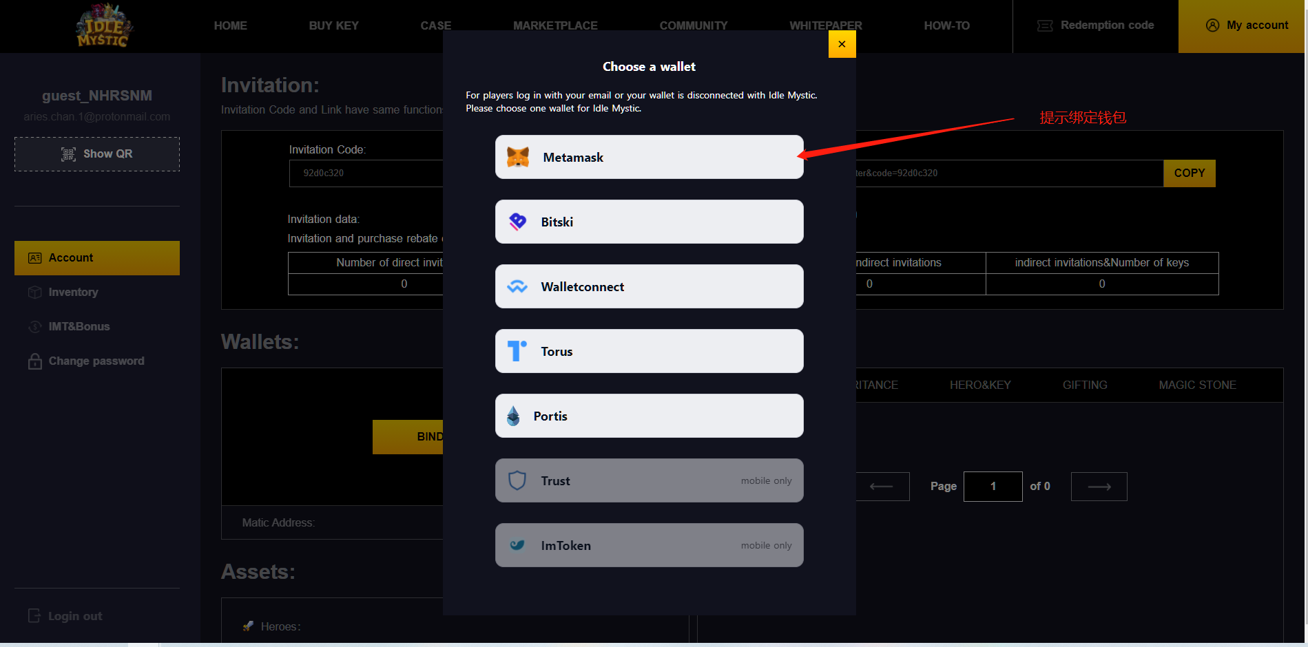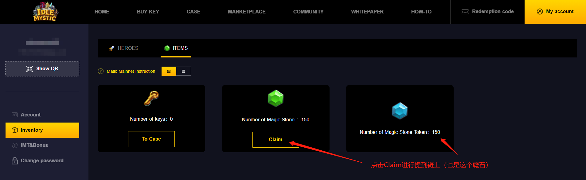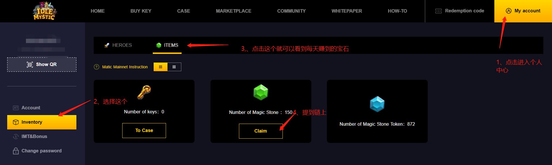 任务获取的魔宝石(绿宝石)不是链上的,需要登陆官网https://www.idlemystic.io/dashboard/inventory进 行提取(须绑定钱包)