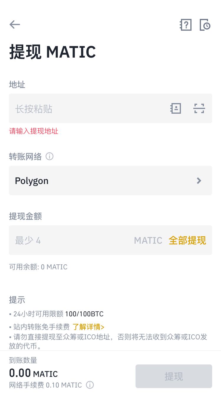 粘贴到币安matic提现详情 ,转账网路选择Polygon,(需在币安现货市场进行购买matic)
