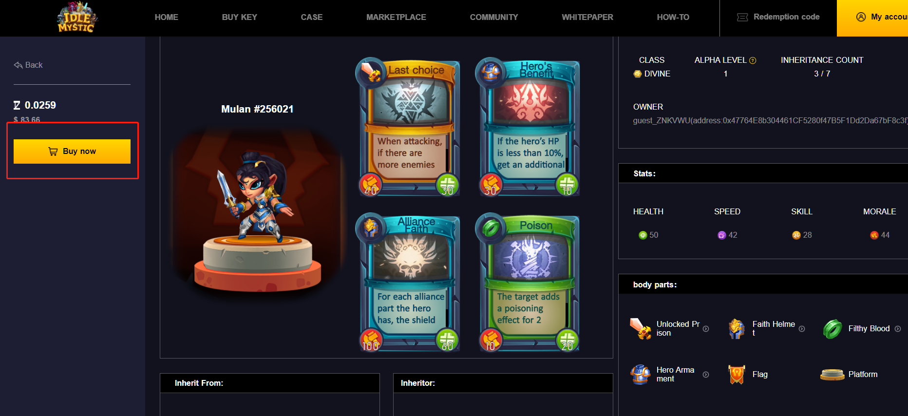 点击英雄进入详情进行购买,点击buy now 进行购买(需要足够的ETH才可购买,可以看上面步骤进行ETH兑换)